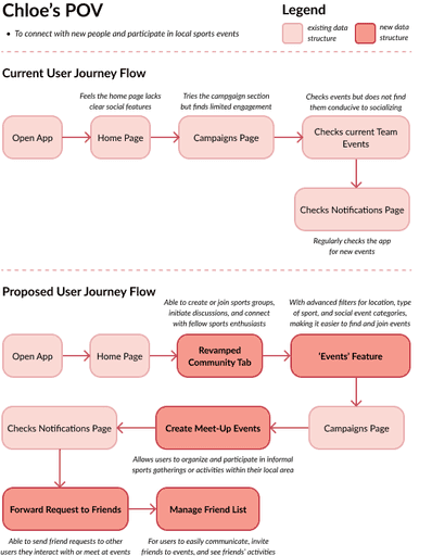 I created user journey flows to support the new features introduced in the ActiveSG app. This included a revamped Community tab, an Events feature, and the ability for users to create meet-up events and share them with friends.