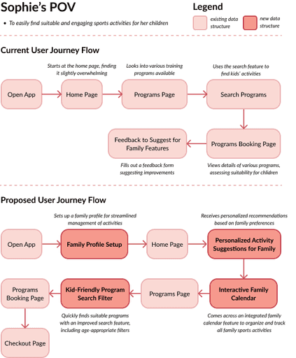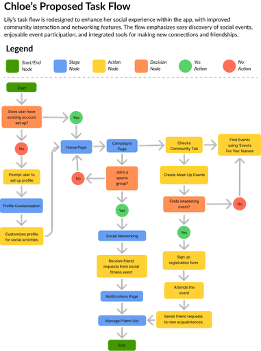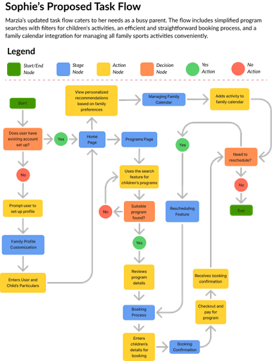 I created proposed task flows to address the needs of different user types by focusing on key goals and pain points. The flows were designed to streamline core actions such as searching for programs, booking activities, and managing schedules, while also enhancing social engagement and community interaction. By tailoring each flow to reflect distinct user motivations and behaviors, I ensured that the overall experience felt intuitive, purposeful, and accessible for a wide range of users.