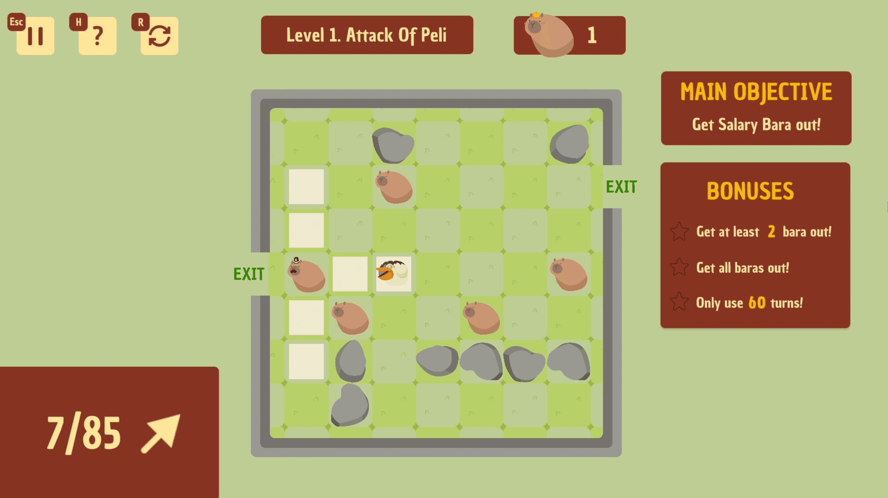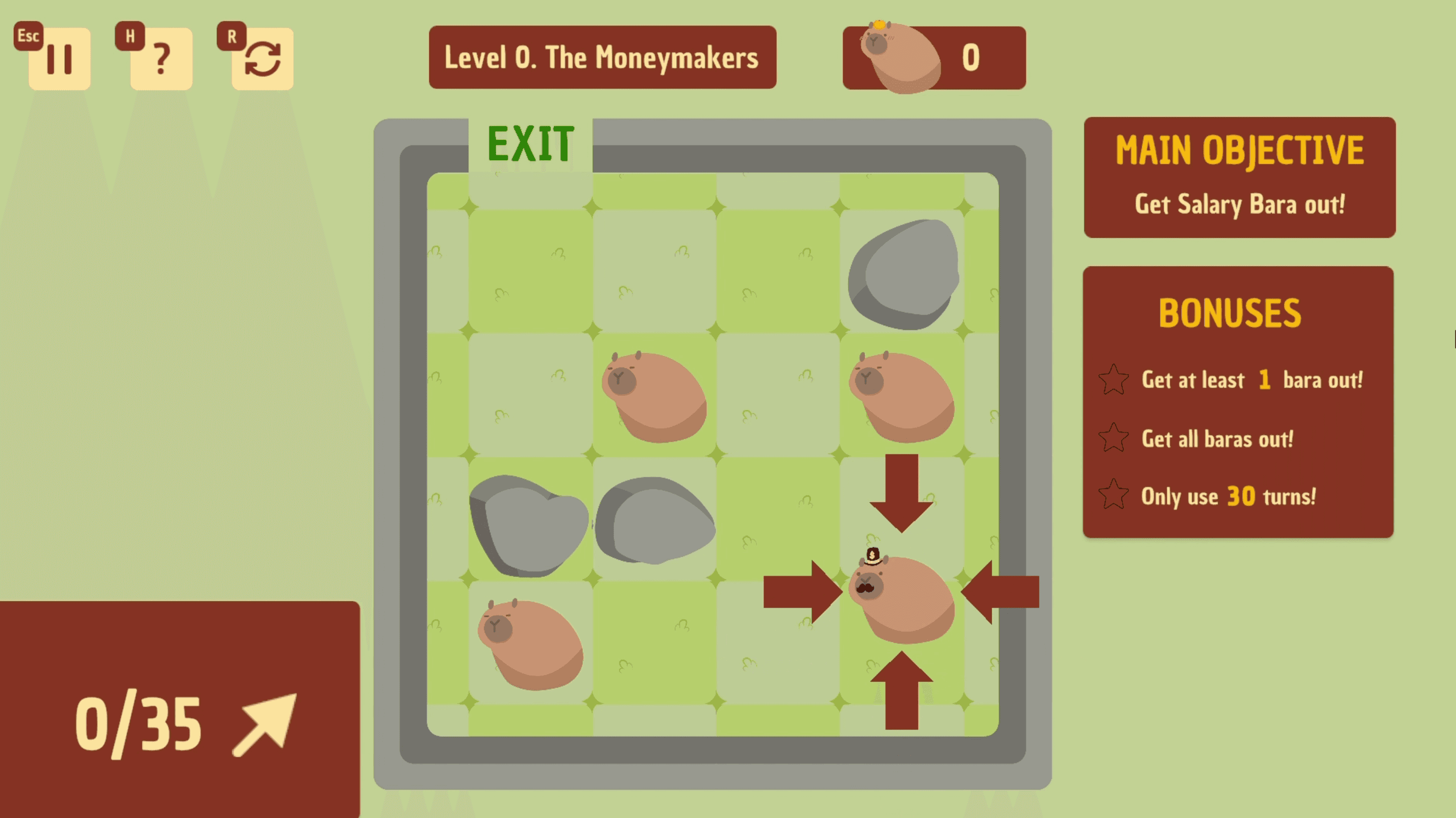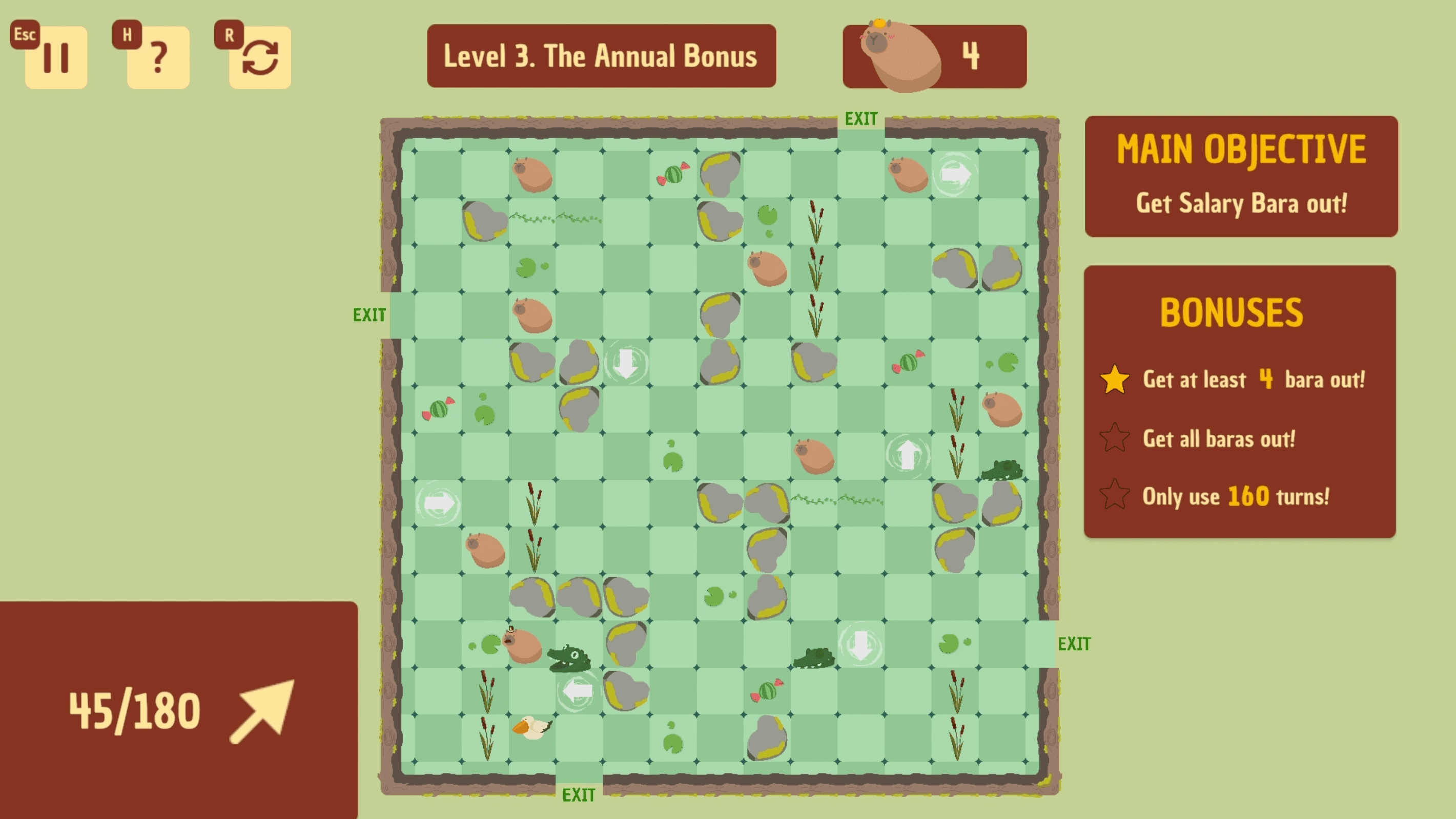 The game challenges players to guide Salary Bara and as many Motivated Baras as possible to safety, avoiding enemies like the cunning Peli and steadfast Gator, each with unique movement patterns. With limited actions and stars awarded based on performance, Capybarism offers a balance of strategy, charm, and fun.