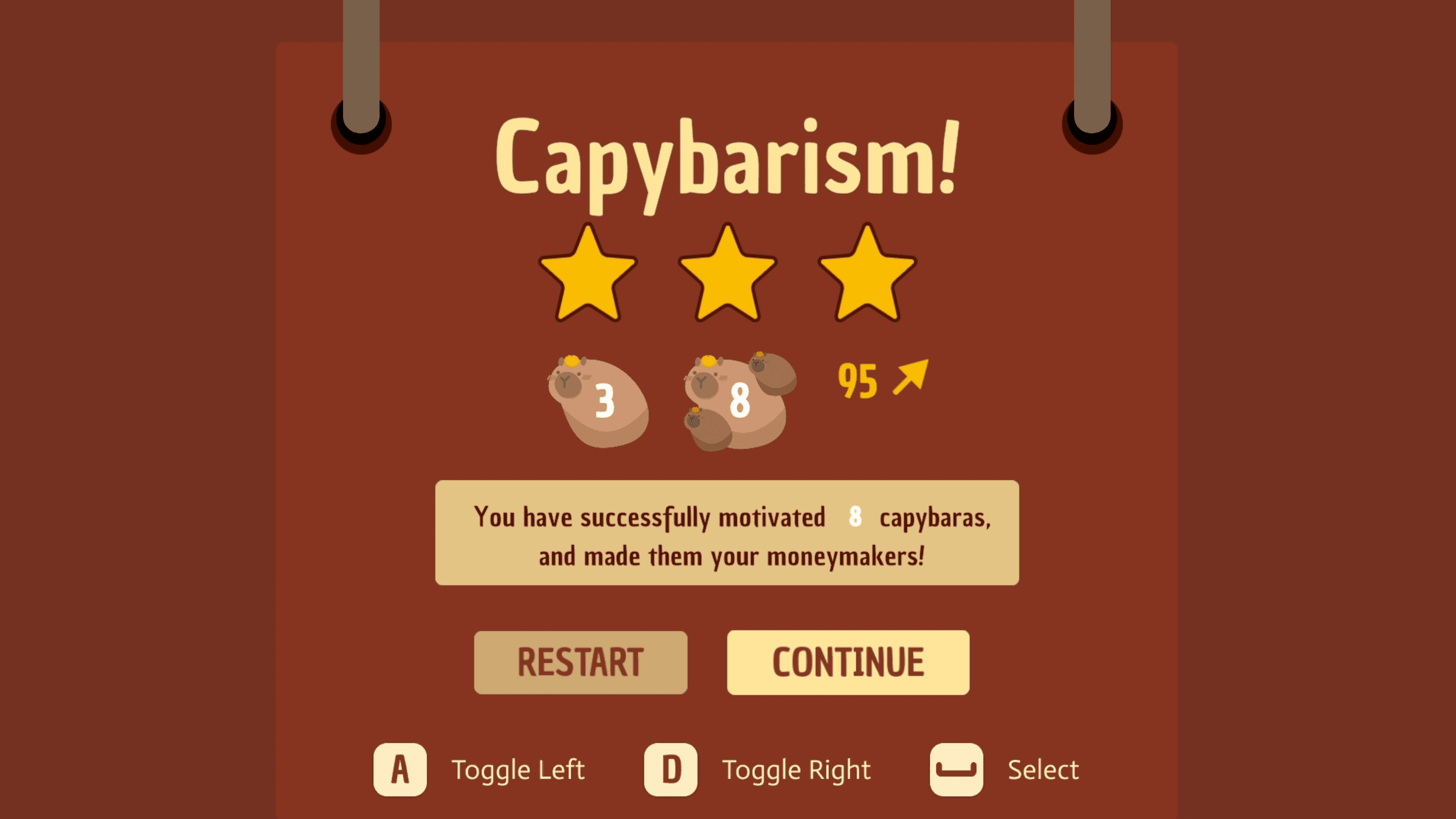 Capybarism stood out for its charming, quirky concept and cohesive visual style, which immediately captured players' attention. The team successfully created a humorous and memorable experience through expressive character animations, playful sound design, and well-integrated UI elements. Collaboration between design, art, and programming went smoothly, allowing for a polished and unified final product.