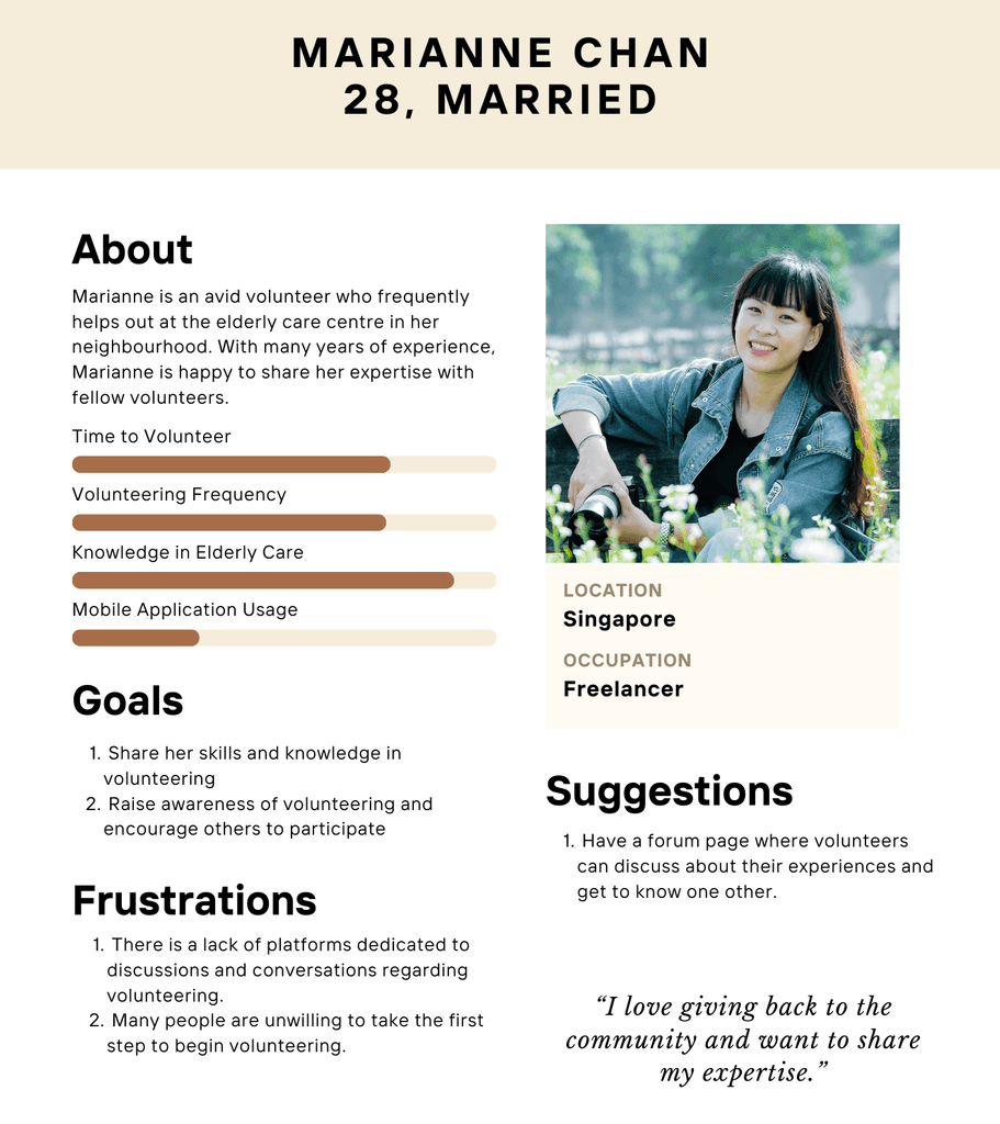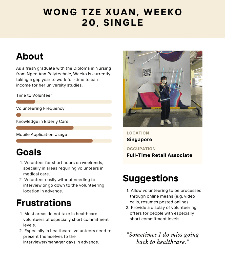 To gain insights into the volunteering preferences and challenges faced by Singaporean youth, we conducted user surveys focusing on their demographic information, platform experiences, and past volunteering experiences.