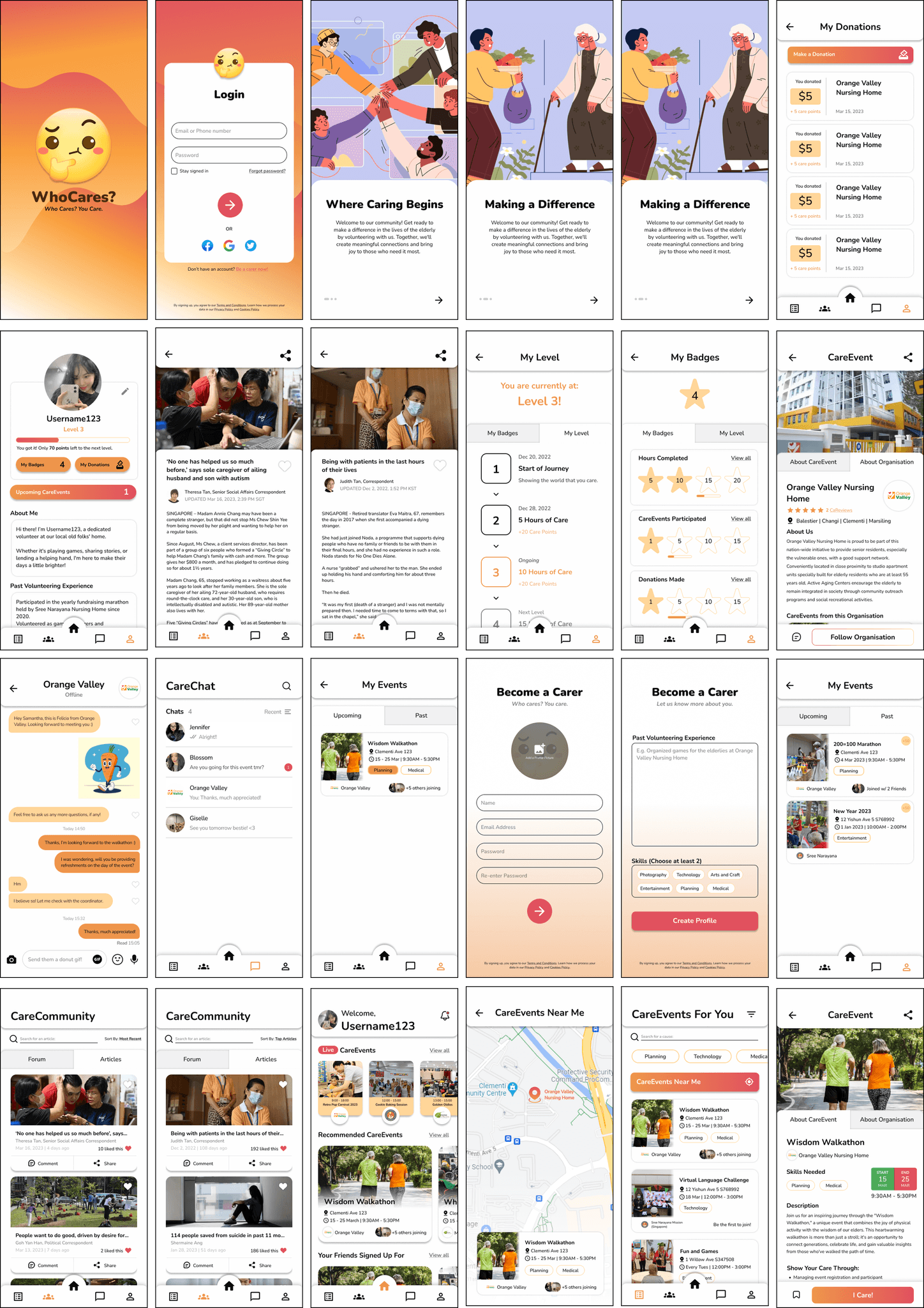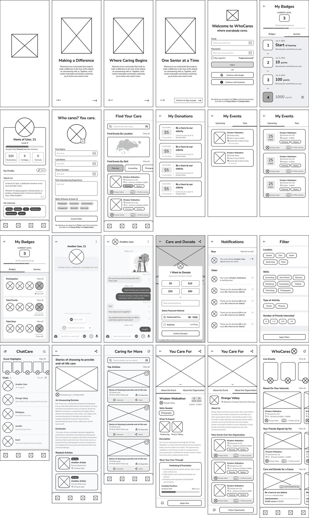 To ensure the WhoCares app effectively addressed the needs of the eldercare sector, we created detailed user flows and user journey maps that reflected the goals and challenges of key users, such as volunteers, staff coordinators, and caregivers. These flows outlined essential tasks such as discovering opportunities, signing up based on skills and availability, and tracking participation.