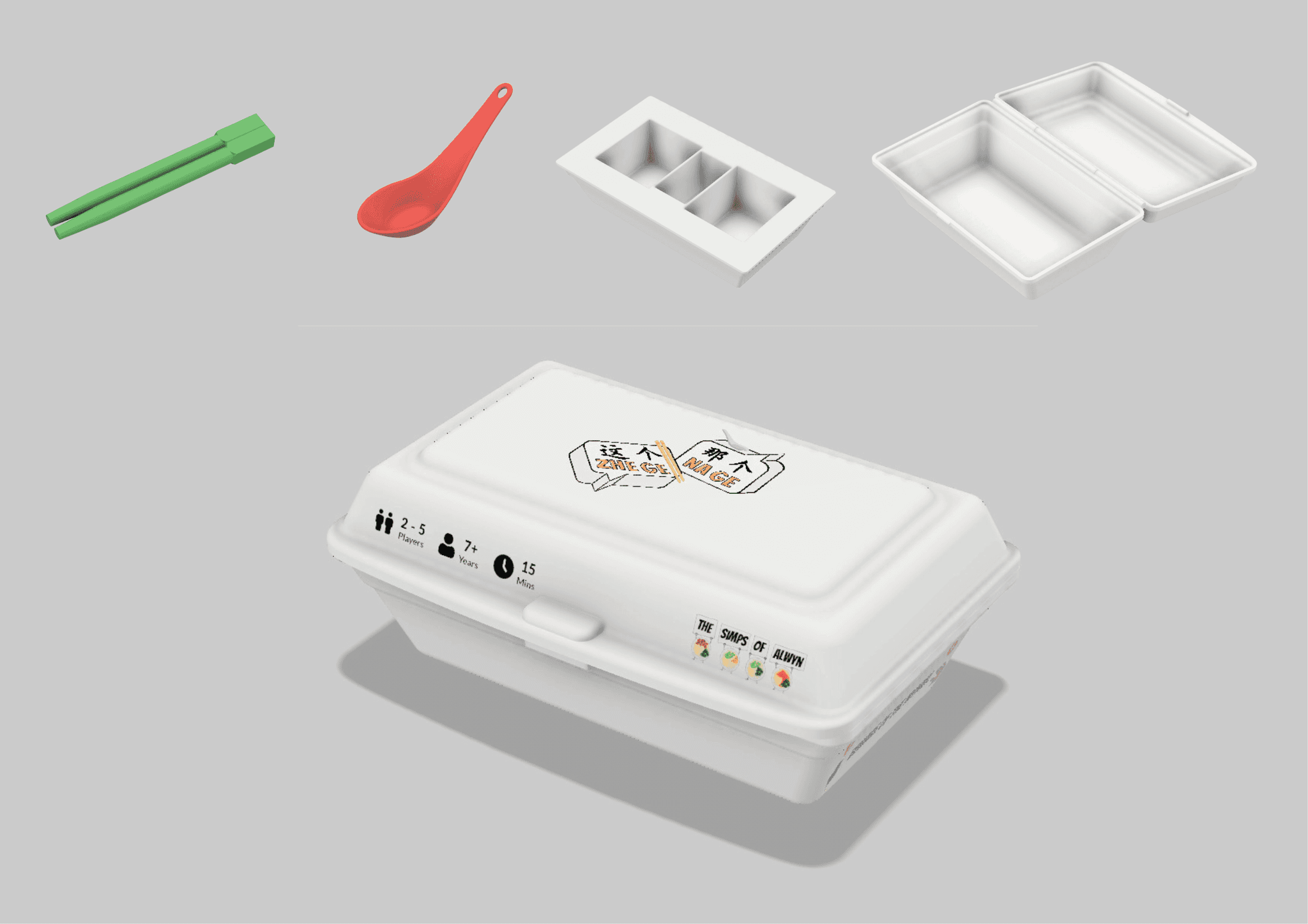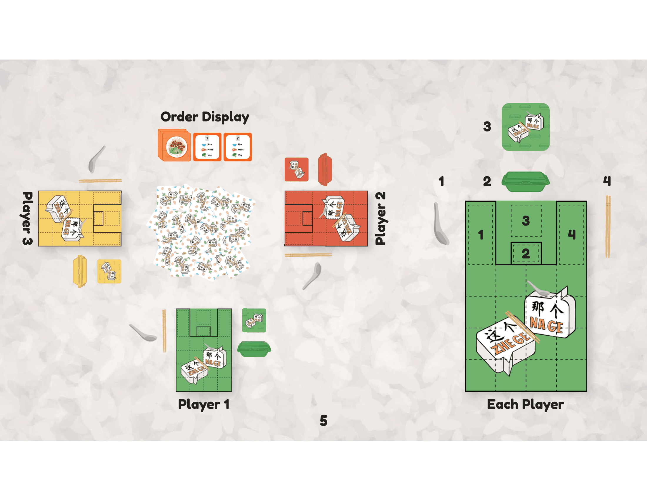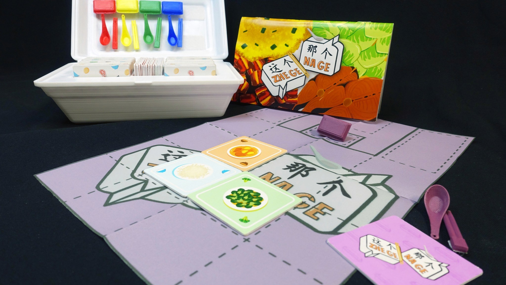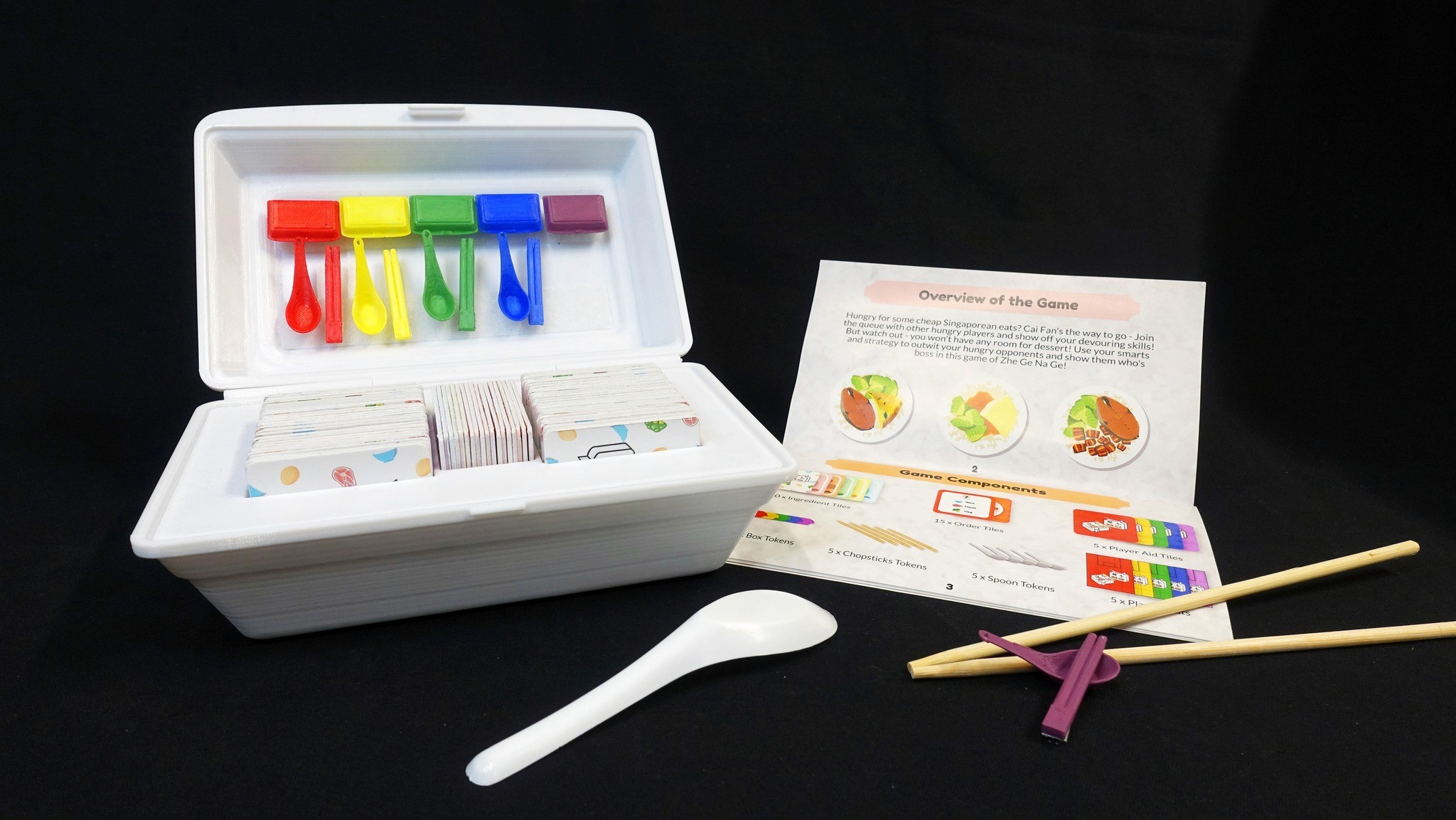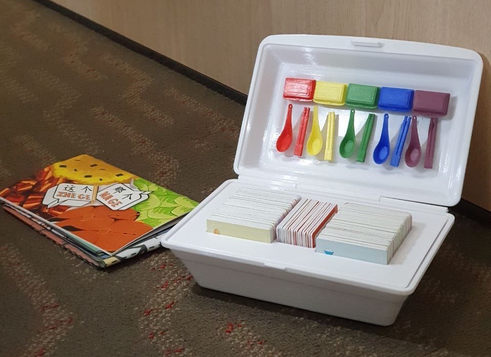 The game box is designed to resemble a takeaway styrofoam container, adding a fun, nostalgic touch. Game tokens are also designed like Chinese spoons and chopsticks to add a playful, immersive touch rooted in local dining culture.