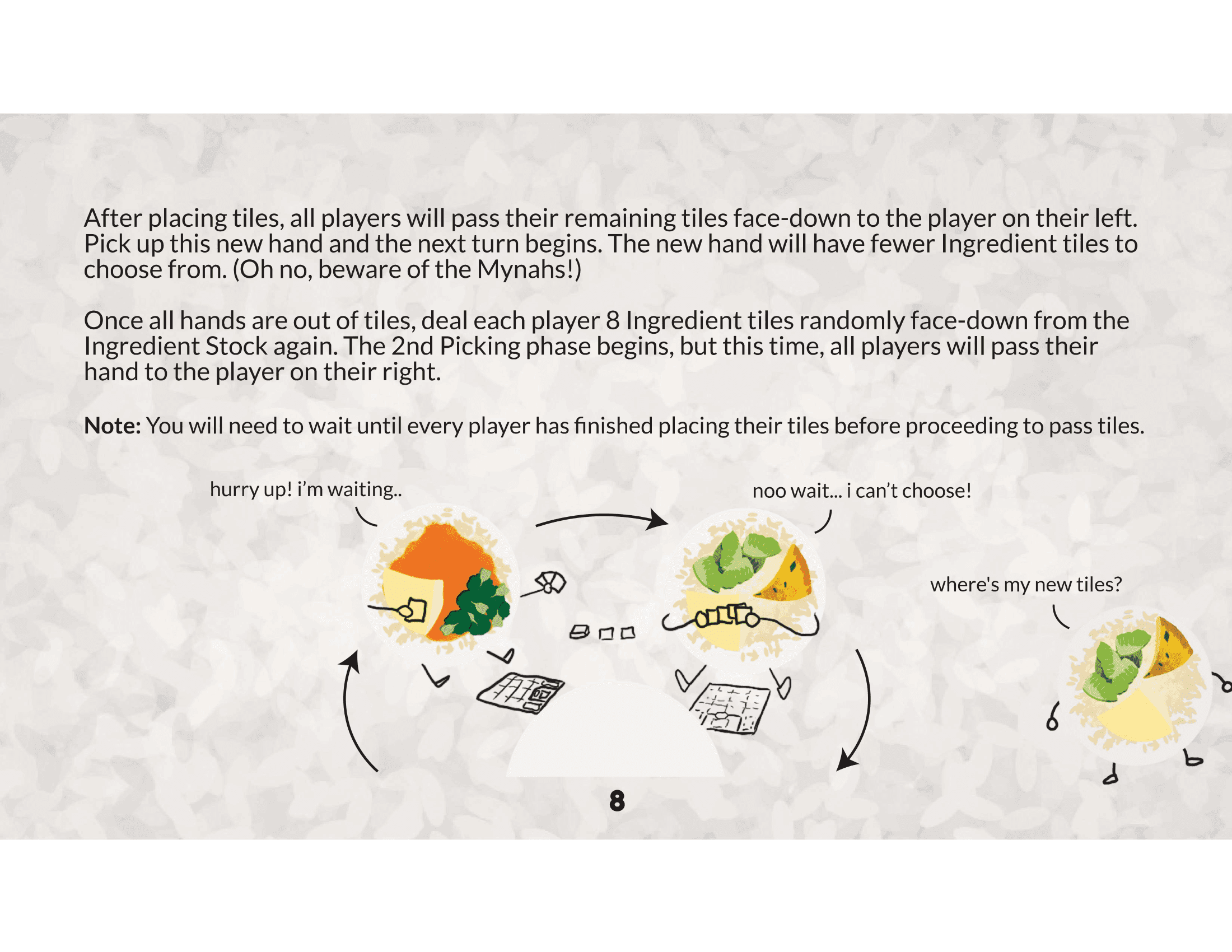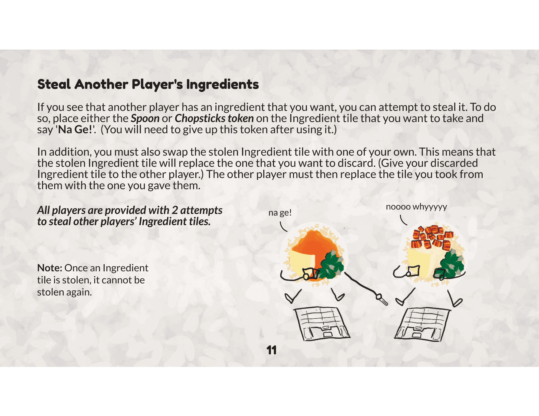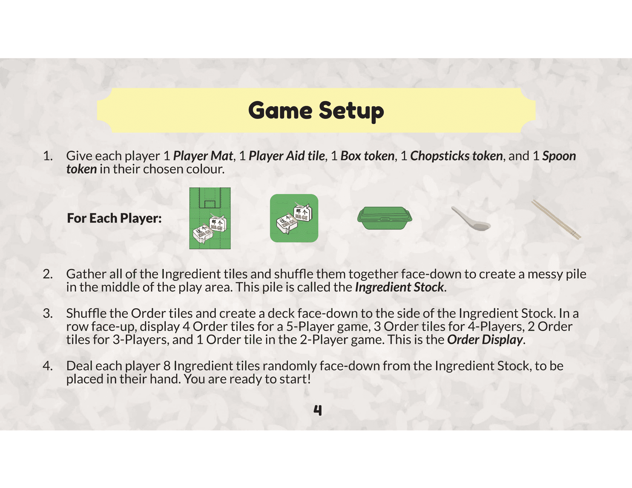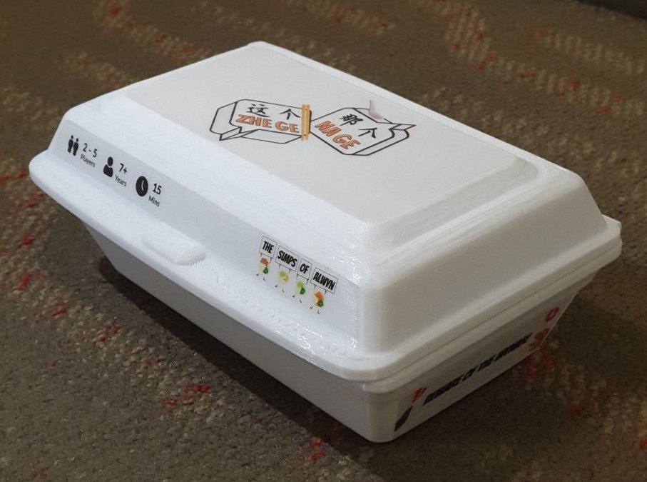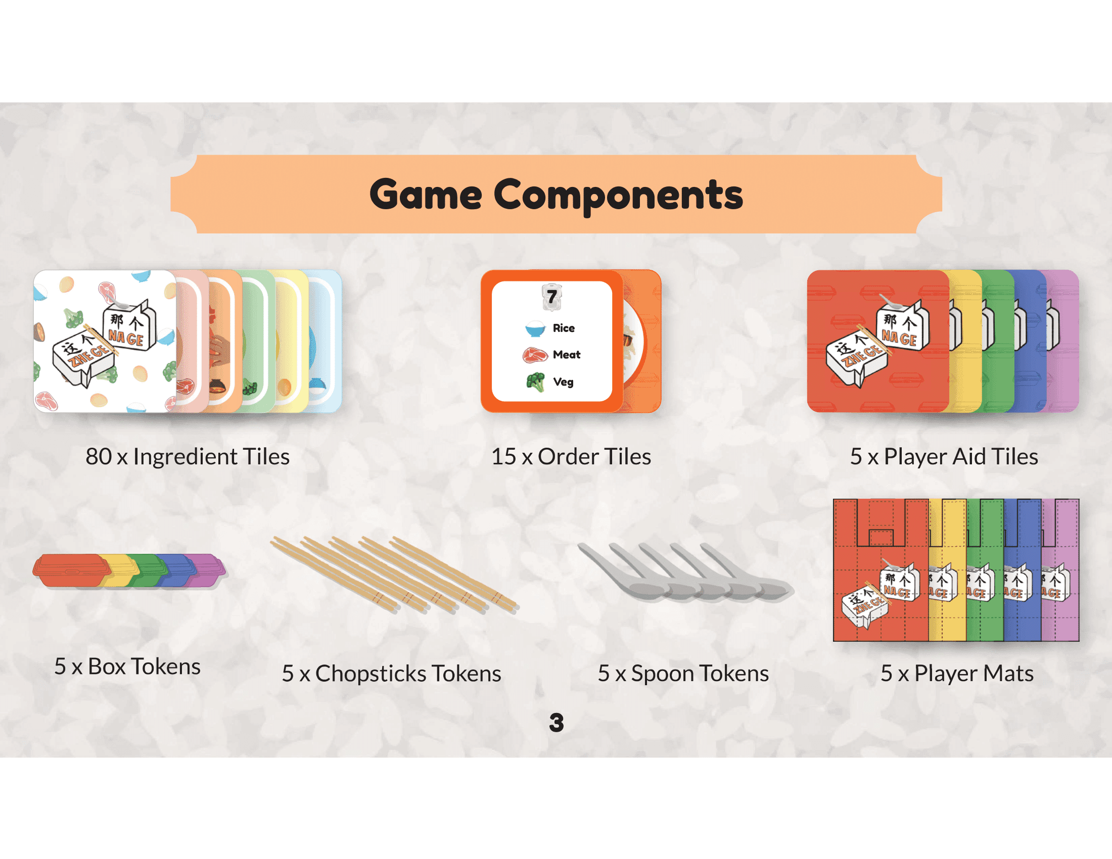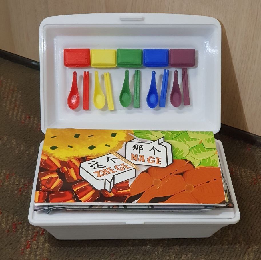 The game box is designed to resemble a takeaway styrofoam container, adding a fun, nostalgic touch. Game tokens are also designed like Chinese spoons and chopsticks to add a playful, immersive touch rooted in local dining culture.
