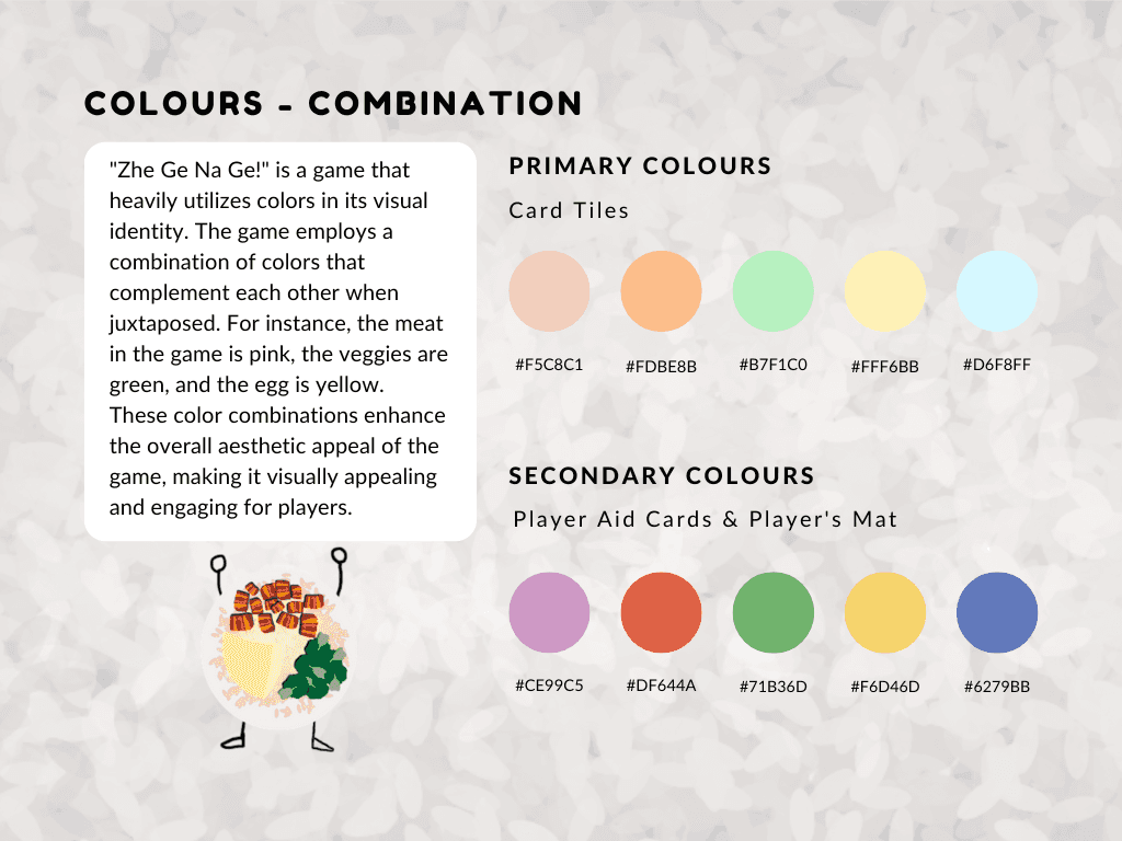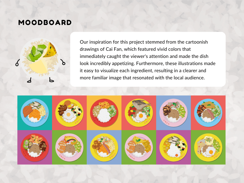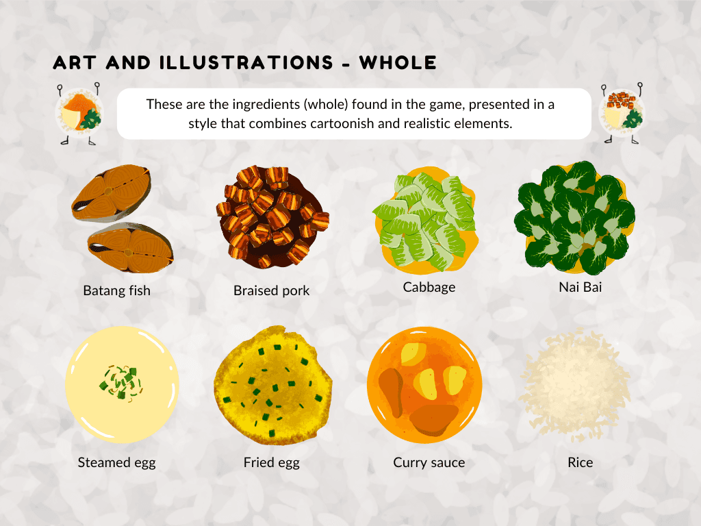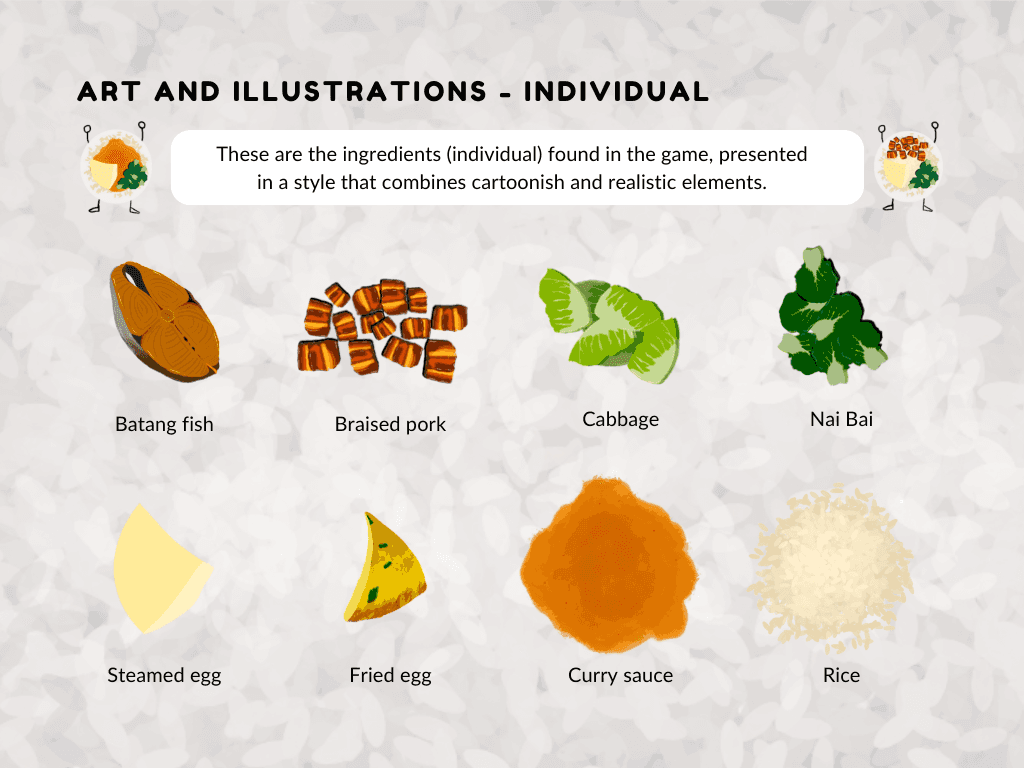 The style is bold, playful, and rooted in Singaporean culture. A vibrant color palette inspired by plastic takeaway bags enhances local flavor, while clean, characterful typography ensures readability. Stylized illustrations of cai fan dishes and familiar visuals bring charm and cohesion to the game’s lighthearted tone.