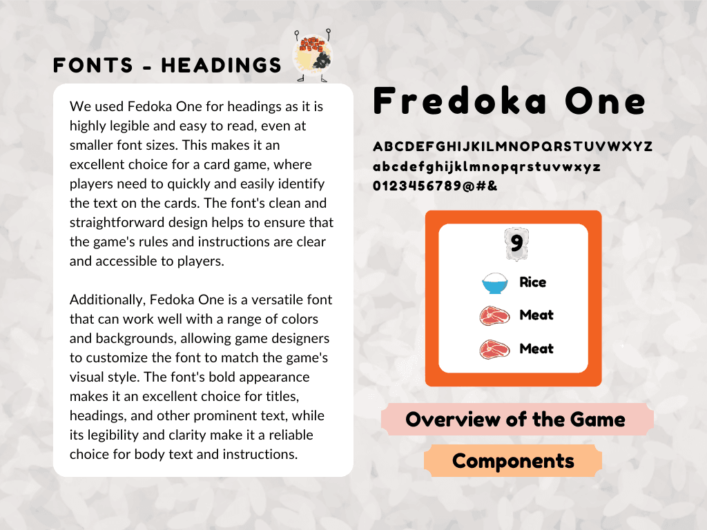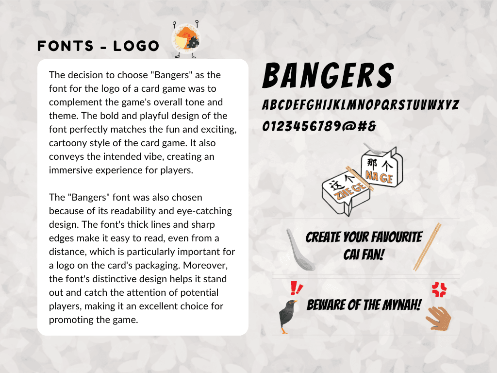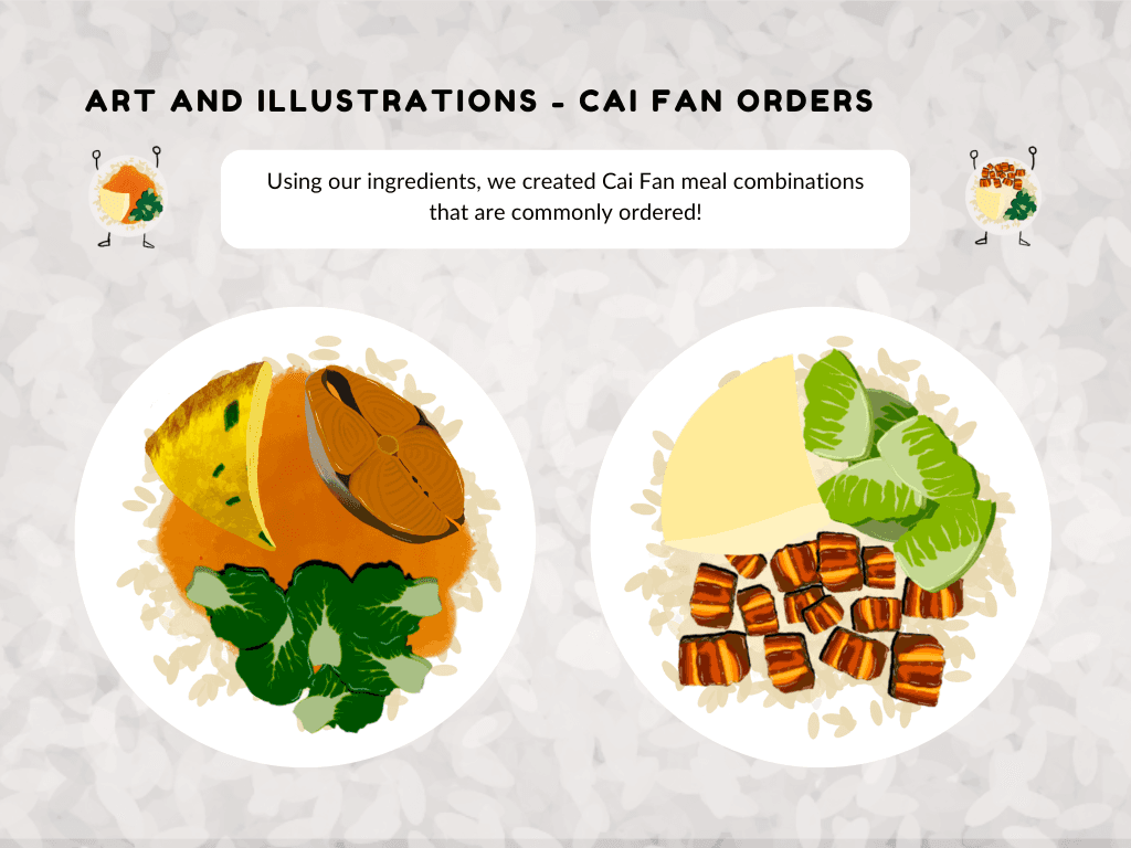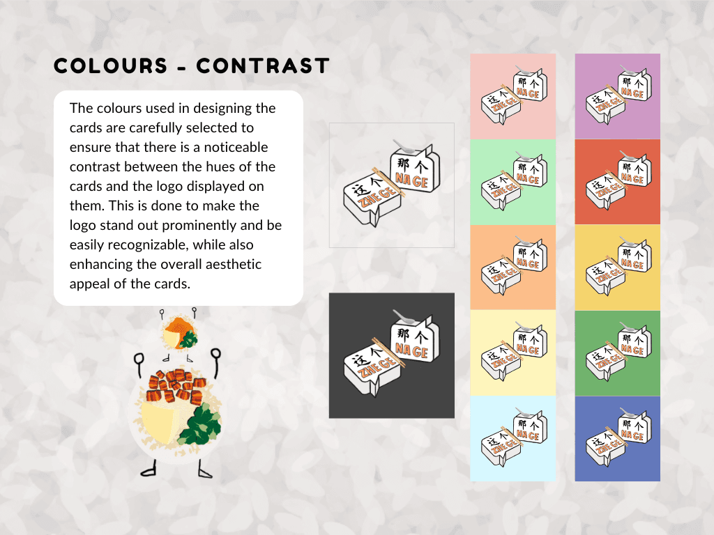 The style is bold, playful, and rooted in Singaporean culture. A vibrant color palette inspired by plastic takeaway bags enhances local flavor, while clean, characterful typography ensures readability. Stylized illustrations of cai fan dishes and familiar visuals bring charm and cohesion to the game’s lighthearted tone.