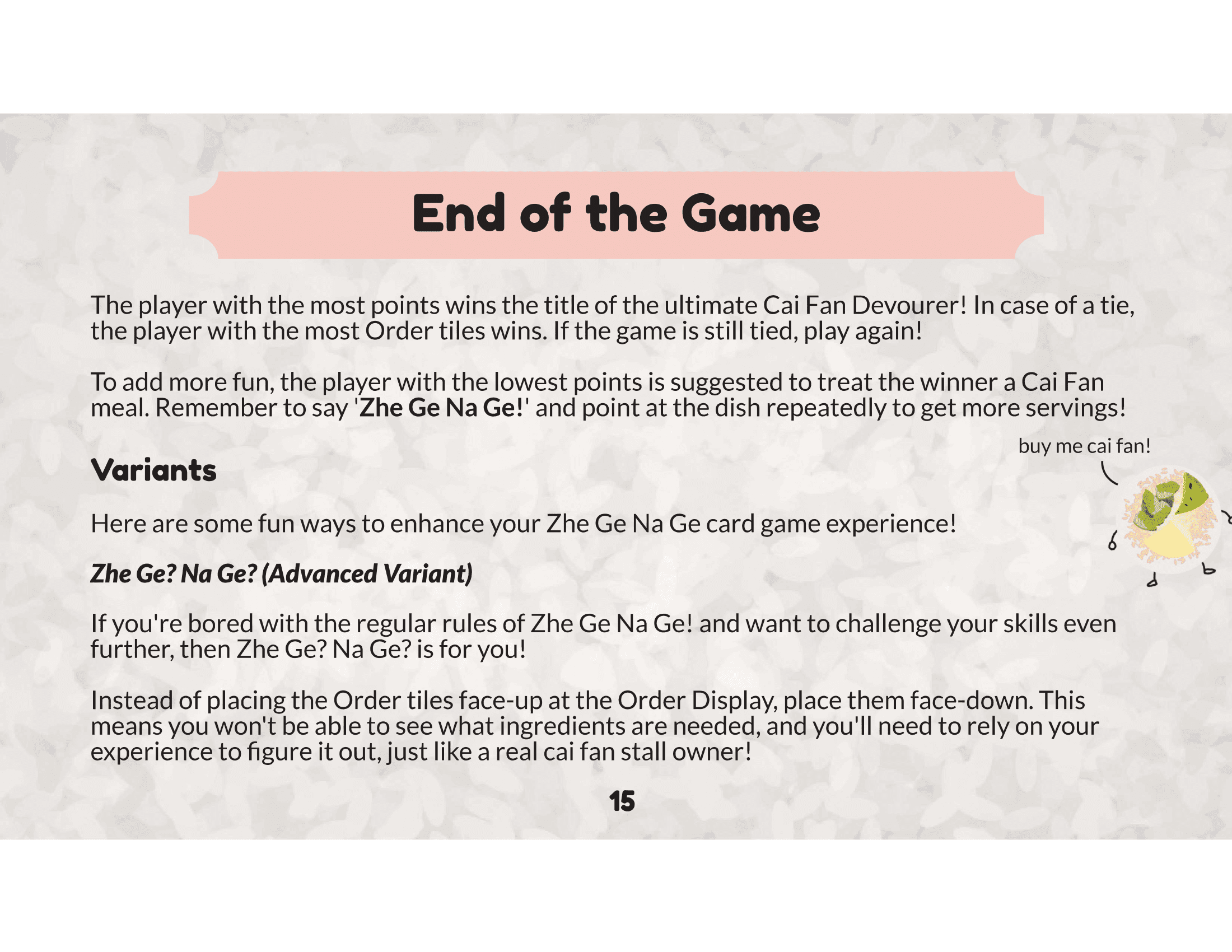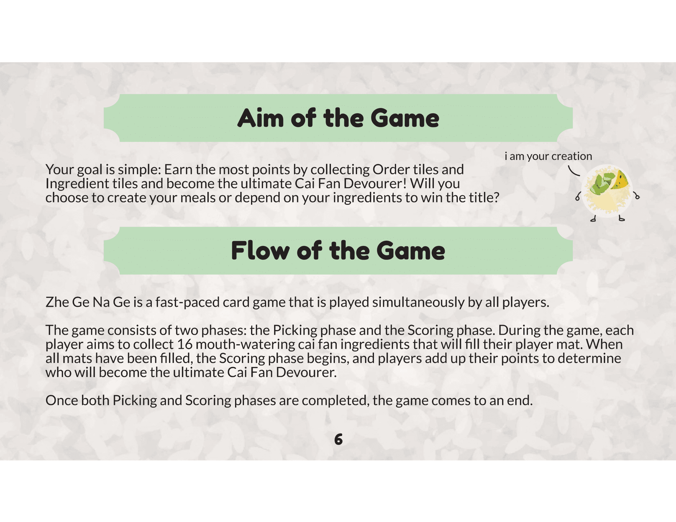 Zhe Ge Na Ge is a fast-paced, strategic card game that brings the thrill of Singapore’s cai fan culture to life. Players compete to collect ingredients, complete orders, and earn the title of the ultimate Cai Fan Devourer. With interactive mechanics like ingredient stealing and pesky Mynah birds to deal with, the game combines strategy, quick thinking, and a touch of humor.